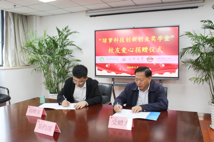 11月15日,我校举行“绿萝科技创新创业奖学金”校友爱心捐赠仪式。安徽绿萝科技有限公司创始人、2009级化工专业校友蒋尚伟,安徽中德教育合作基金会秘书长何世昆,能源材料与化工学院党委副书记魏安乐及学生处相关负责老师参加捐赠仪式。仪式由基金会管理办公室主任刘金平主持。