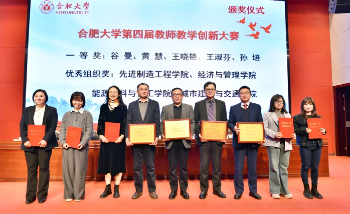 大会还举行了颁奖仪式。校领导为荣获“第四届教师教学创新大赛、第十四届青年教师教学基本功大赛、2024届本科毕业设计(论文)优秀指导教师”一等奖获奖教师和优秀组织奖教学单位颁发证书并合影留念。