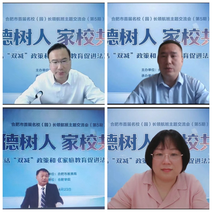 合肥九中党委书记、校长章伟,长丰县梅冲湖学校书记、校长高伟,合肥市翡翠学校党支部书记、校长丁文进,合肥市星海幼教集团总园长李莹分别以“‘六大行动’落实双减、‘学在九中’ 提质增效”、“全面学习《家庭教育促进法》,构建家校社立体网格”、“‘双减’背景下小学生校外成长共同体建设的实践与思考”和“让教育为每个人的成长铺路”为主题进行了交流发言。