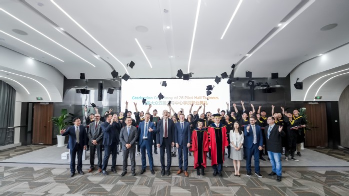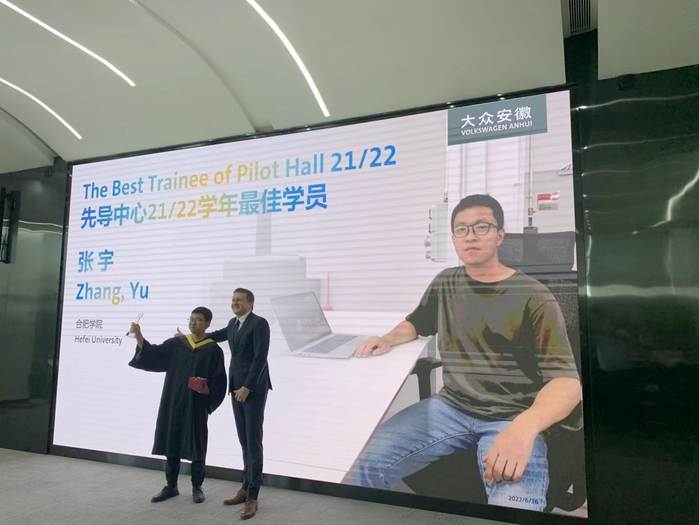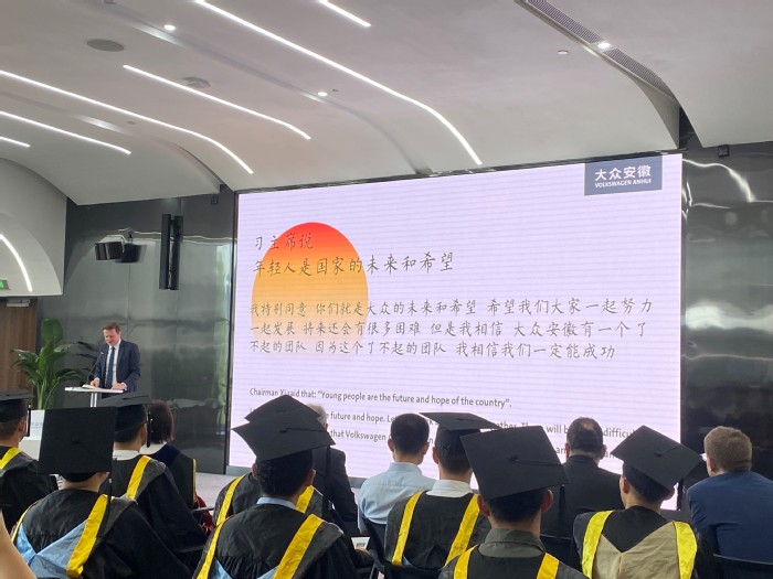 Am 16. Juni schloss die erste Gruppe der von der Universität Hefei in Zusammenarbeit mit dem Volkswagen Konzern ausgebildeten „Nachwuchsingenieure“ ihre Ausbildung erfolgreich ab. Die Präsidentin der Universität Hefei Wu Chunmei nahm an der von Volkswagen Anhui veranstalteten Abschlussfeier teil. Herr Jens Pfitzinger, stellvertretender Vizedirektor des Volkswagen Konzerns (China), Dr. Gabardi, Chief Executive Officer bei Volkswagen (Anhui), Herr Schneider, Chief Manufacturing Officer, Dr. Ludger Lührmann, Chief Technical Officer, Herr Jian Shao, Chief Human Resources Officer sowie Führungskräfte und Lehrkräfte aus dem Büro des Präsidenten, dem Büro für akademische Angelegenheiten, dem Büro für internationalen Austausch und Zusammenarbeit, demInstitut of Advanced Manufacturing Engineering und dem Institut of Artificial Intelligence and Big Data nahmen an der Abschlussfeier teil.