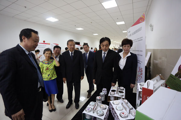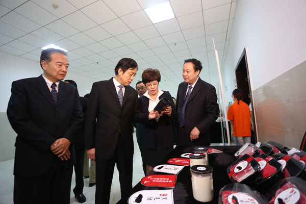 在展出现场,台湾两岸和平发展联合会主席蓝博洲、铭传大学校长李铨、台湾抗日志士亲属协进会创会会长林光辉、海峡两岸关系协会副会长孙亚夫、安徽省政府副省长谢广祥、安徽省台办副主任泗淇、合肥市委副书记凌云、合肥学院党委书记蔡敬民、合肥学院校长张文兵等认真参观了学生们的设计作品。