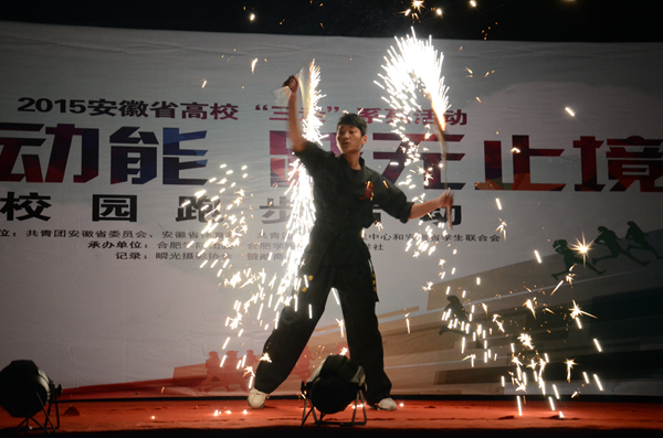 杜娟希望全体学生积极响应活动的主题“走下网络,走出宿舍、走向操场”,踊跃参与“三走”系列活动,努力提高身体素质,并祝愿此次活动取得圆满成功。动感的音乐、炫酷的舞步,开场秀街舞表演点爆全场,带动全场气氛。在多彩晚会环节,炫酷的火花双截棍,行云流水的动作,熠熠生辉的花火让观众大饱眼福,获得了热烈的掌声;“因得千金摆腰身,一屏竞展风姿妙”的孔雀舞震撼全场,舞者将身姿融入悠扬的音乐中,时快时缓的节奏将孔雀的神态展现得淋漓尽致;一曲婉转低沉的萨克斯演奏流露出的悲伤感染了现场每一个人;美妙歌喉与动感吉他的完美结合等节目让现场观众领略了一场视听盛宴。现场掌声阵阵,持续不断。最后,同学们便进入了“荧光夜跑”环节,头戴着荧光头饰,手拿荧光棒,在夜幕里奔跑,为校园增添了一道别致靓丽的风景线,也突出了当代大学生积极向上,热爱生活的精神风貌。