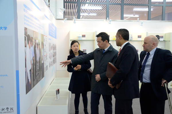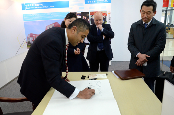 期间,英国德比市代表团一行参观了中德共建合肥学院三十周年成果展。张文兵从合肥学院发展状况、国际化合作以及中德合作专业学术交流等方面介绍了我校的整体情况,以及中外师生交流、文化交流、科研合作、专业共建等多类合作项目开展情况。拉杰·邦威在留言台写下对合肥学院的衷心祝福。