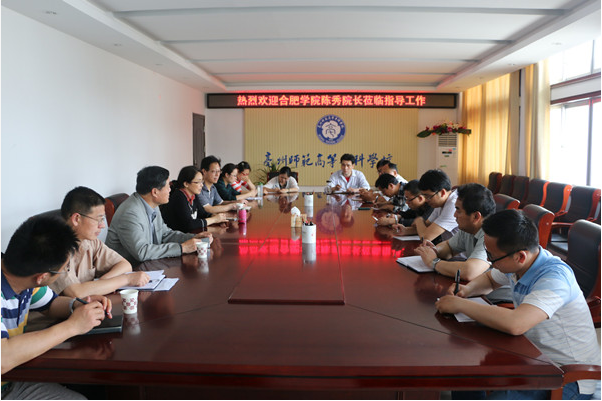 陈秀在与数学教师交流时,介绍了我校的应用型办学经验、本科合格评估、教学质量监控、教学督导和绩效工资评定等方面的做法,并对亳州学院数学学科的建设与发展提出了指导性的建议。她指出,亳州学院数学学科的专业基础较好,大家应该充分利用这一优势,对本科专业的设置、发展定位要有充分的论证、调研,既要符合亳州地方经济社会发展需要,又要符合学校应用型的发展办学定位;在学科发展、教师成长、教学科研等业务能力的提升方面既要结合自身实际,又要学习借鉴其他高校的成功经验,取长补短。