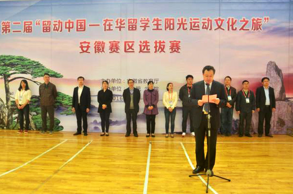 510号,我校体育馆内热闹非凡,由安徽省教育厅主办、合肥学院承办的第二届“留动中国——在华留学生阳光运动文化之旅”安徽赛区选拔赛在我校拉开帷幕。安徽省教育厅副厅长杨金龙、校党委书记蔡敬民、省教育厅外事处处长丁育红、我校国际交流合作处长贾峰等出席开幕式。