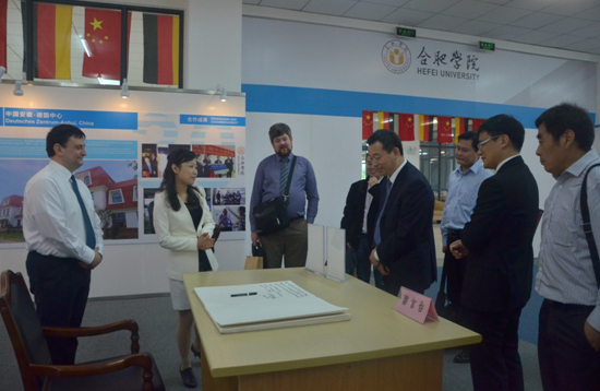 会后,德比大学代表团一行在张文兵等人的引导下参观了我校中德合作共建三十周年成果展。过程中,张文兵对中外合作专业学术交流的整体情况做出介绍,另外,还说明了中外师生交流、文化交流、科研合作、专业共建等多类合作项目的情况。最后,尼克·安东诺普洛斯在留言台上写下了对合肥学院的衷心祝福。