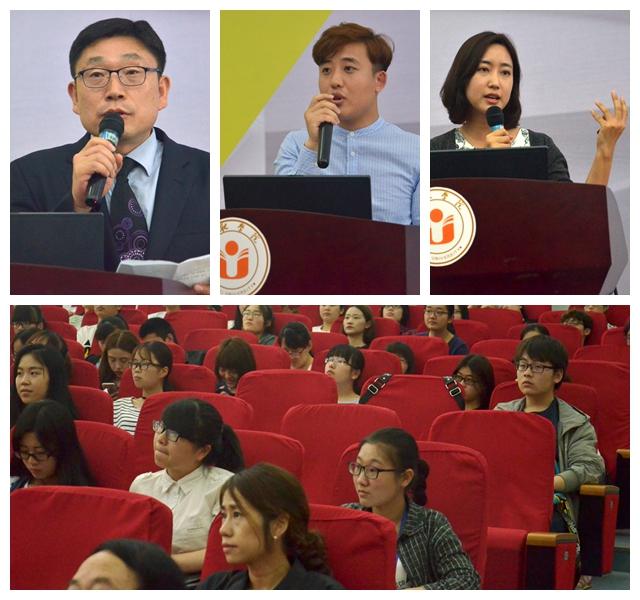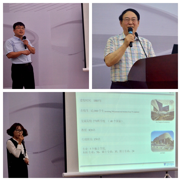 会上,金承泰简明扼要的介绍此次推介会的一些相关内容,并以播放PPT的形式向在场学生详细展示大田的特色文化生活、环境、科学,交通等一些相关内容。随后,沈萍对这些学校的到来表示感谢。紧接着,牧园大学、建阳大学、韩国大田大学、培材大学、韩巴大学以及忠南国立大学六所高校负责人分别对各自学校的特色魅力之处,学校的收费标准、专业特色、校内基础设施建设、校内的环境等相关信息作了简要的概括。